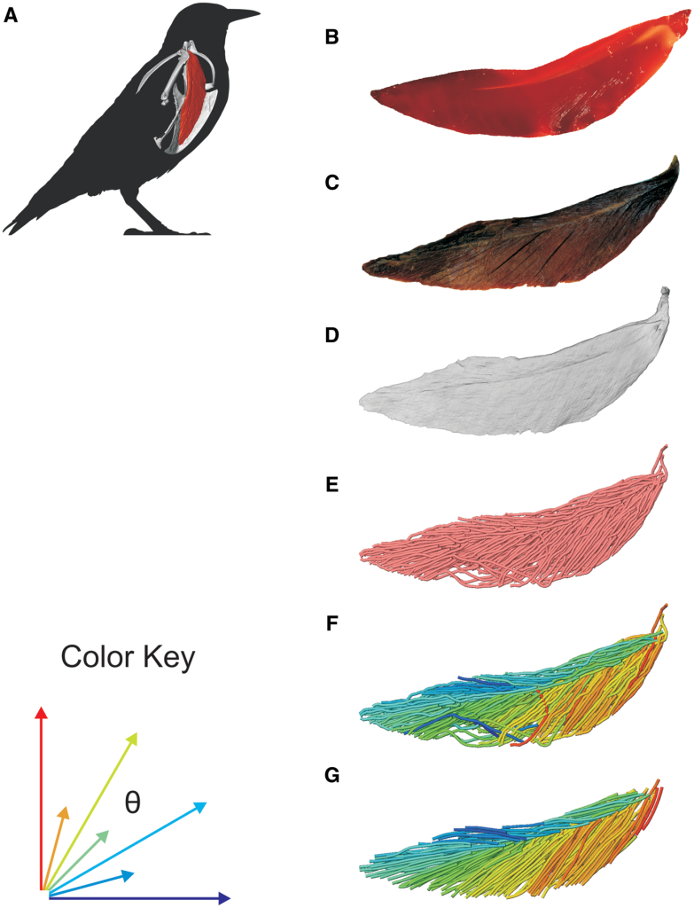 Avian flight is achieved through a number of modifications to the body, including the pectoral girdle (…). Muscle architecture is a critical variable in determining the biomechanical function of the vertebrate musculoskeletal system; however, accurate three-dimensional (3D) understanding of muscle architecture has been historically difficult to acquire. Here, we present a musculoskeletal model of a European starling (Sturnus vulgaris) pectoral girdle generated from iodine contrast-enhanced micro-computed-tomography (CT) data and 3D fiber tracking analysis. We used a template-based fiber-tracking algorithm to reconstruct muscle fibers in 3D based on grayscale differences in CT images, which allowed us to estimate fascicle lengths, pennation angles, muscle volumes, and physiological cross-sectional area. (…) digital fiber tracking offers numerous advantages over gross-dissection methods, most importantly, the ability to visualize and quantify entire muscles in three-dimensions, yielding a much more accurate estimation of whole muscle architecture.
