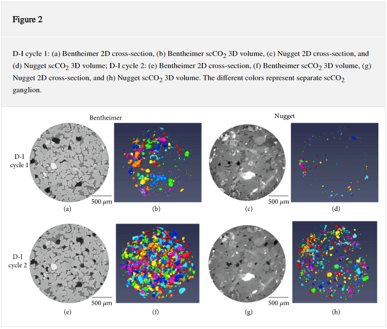 During a Geologic Carbon Storage process, supercritical CO2 (scCO2) is subjected to a series of dynamic and static conditions where the relationship between pore geometry and the trapped scCO2 curvature remains to be established. To mimic the dynamic process, two sandstones, Bentheimer and Nugget, were subjected to two successive drainage and imbibition (D-I) cycles and X-ray computed tomography scanned at each residual state to capture the wettability evolution at static conditions in the same pore geometry. […] From this work, we suspect the pore geometry is playing a role in scCO2 size distributions and use this information to suggest using water pulses to enhance trapping capacity in lower porosity sandstones.