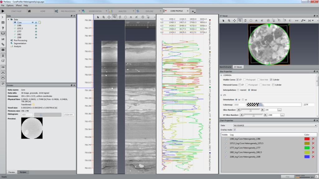 A processing step unique to PerGeos allows the cores barrel to be intelligently removed, the core to be re-oriented if it is not perfectly vertical, and all the cores to be stitched together regardless of the total size. These steps are achieved automatically without any interaction from the user. The data are then stitched into a single file from 100+ individual cores–generating file sizes that rapidly surpass 100s GB in size. Users, however, are still able to visualize the data via a proprietary multi-resolution file format ( LDM ) allowing an immediate and complete visualization independently of the machine power. This allows a user to browse in real time an entire 3D digital well of 100+ cores and apply post-processing operations such as logs generation from image segmentation and analysis without investing in specialized hardware.