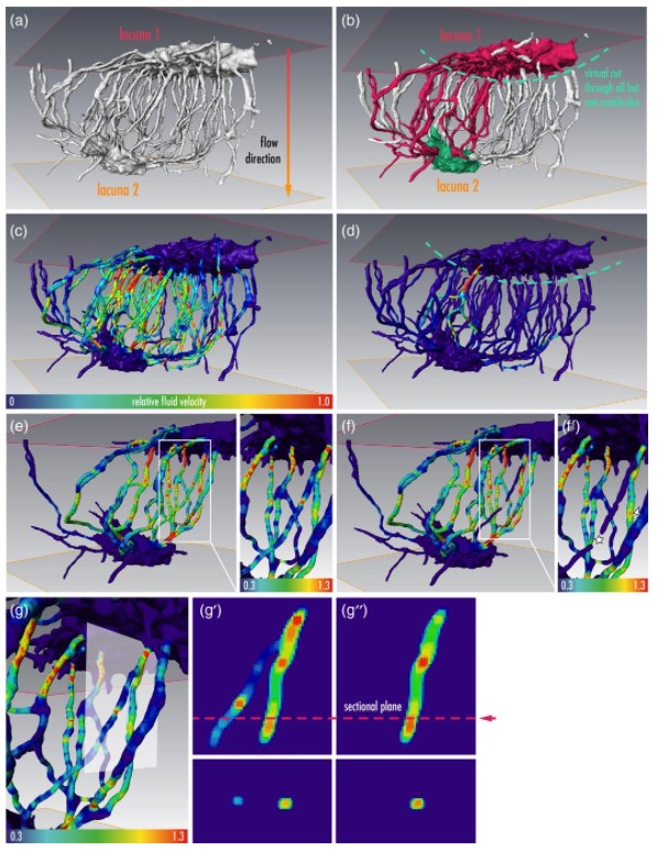 One segmented dataset per bone type (jaw 1, femur 1, HO 1) was additionally used for fluid analyses in Thermo Scientific Avizo Software (Version 2020.2, Thermo Fischer Scientific Inc., Waltham, MA, USA) using the XLab toolbox. A surface determination was applied on the binary data using the iso value approach. The parallel planes defining the fluid inflow and outflow were chosen within the lacunae. Transport phenomena simulations were performed in the experiment mode, analyzing the stationary field (e.g., velocity) of a laminar flow of an incompressible medium for both directions. The simulations were stopped when the estimation of the convergence criterion at each iteration reached 10−5 or the number of iterations reached 106. To simulate a compromised LCN, the datasets were further manipulated so that all canaliculi except one were virtually cut close to one lacuna. The fluid analyses were then repeated for both flow directions. Absolute permeability is defined as the measure of the ability of a porous material to transmit a single-phase liquid in units of darcy (d), with 1d = 0.987 μm2. Through Darcy’s law the fluid and flow were computed. To numerically estimate the absolute permeability, the Strokes equations are solved. All simulation were performed using the XLab toolbox of Avizo.