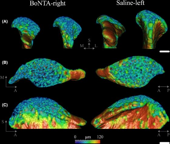 Masseter muscle function influences mandibular bone homeostasis. As previously reported, bone resorption markers increased in the mouse mandibular condyle two days after masseter paralysis induced with botulinum toxin type A (BoNTA), followed by local bone loss. This study aimed to evaluate the bone quality of both the mandibular condyle and alveolar process in the mandible of adult mice during the early stage of a BoNTA‐induced masseter muscle atrophy, using a combined 3D histomorphometrics and shape analysis approach.