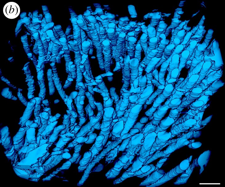 Slices were stacked, aligned and microfossils within these were segmented using Amira software.