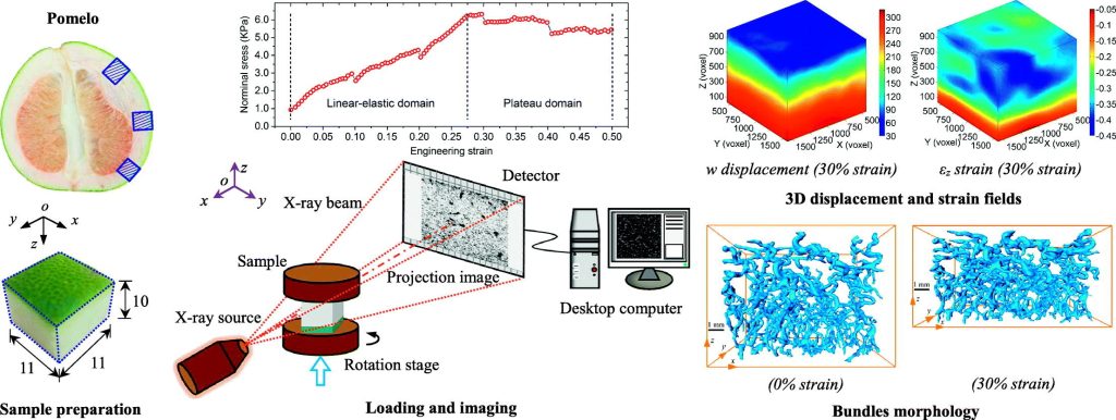 Among natural cellular materials, pomelo peels, having a foam-like hierarchical microstructure, represent an ideal model for developing materials with high energy absorption efficiency. In this work, by combining X-ray tomographic imaging technique and digital volume correlation (DVC), in-situ stepwise uniaxial compression tests were performed to quantify the internal morphological evolution and kinematic responses of pomelo peel samples during compression.