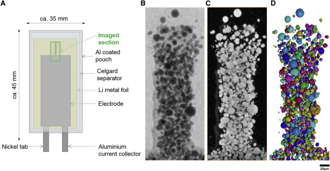 Nickel-rich transition metal oxide materials […] are of great interest for achieving immediate improvements in the energy density of Li-ion batteries and for risk reduction within the Li-ion battery supply chain. […] An increase in Ni content in NMC materials leads to accelerated degradation […]. This potentially complicates their adoption in applications requiring extended cycle life such as in electric vehicles. Recent developments in X-ray characterization tools have provided unprecedented insight into the structural, chemical, and electronic states of materials, and these tools have been harnessed to probe Li-ion batteries both in the lab and in large-scale synchrotron facilities. […] Here, we present a proof-of-concept correlative in situ 3D micro-CT and 2D spectroscopic TXM study on a polycrystalline NMC811 electrode in a half-cell arrangement within our specialized tab pouch cell during its initial delithiation (charge).