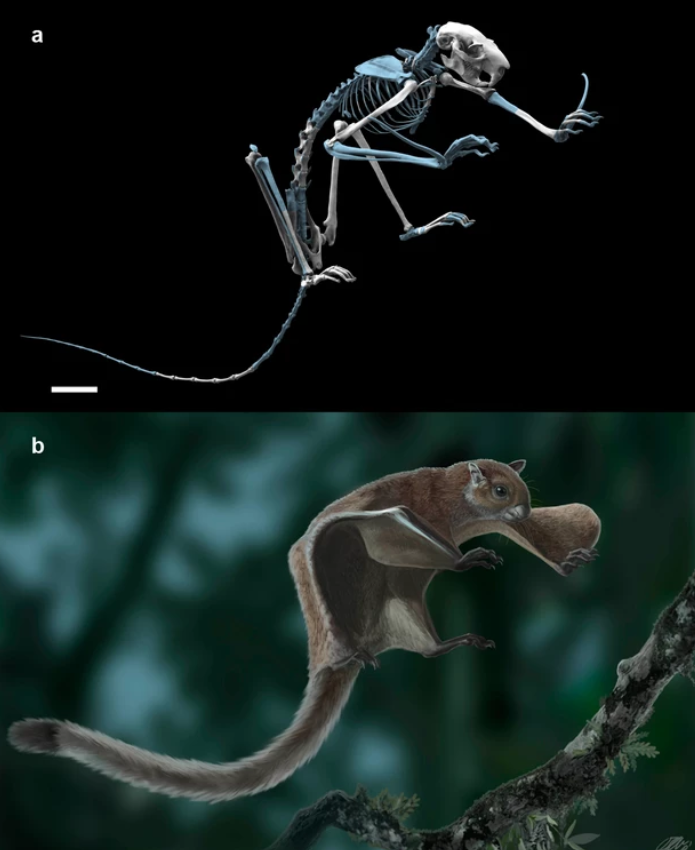 Here we report the oldest fossil skeleton of a flying squirrel (11.6 Ma) that displays the gliding-related diagnostic features shared by extant forms and allows for a recalibration of the divergence time between tree and flying squirrels. Our phylogenetic analyses combining morphological and molecular data generally support older dates than previous molecular estimates (~23 Ma), being congruent with the inclusion of some of the earliest fossils (~36 Ma) into this clade. They also show that flying squirrels experienced little morphological change for almost 12 million years.