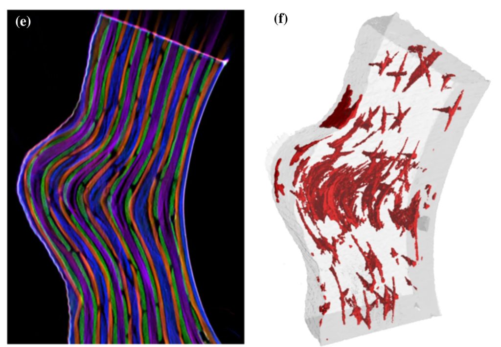 The high strength at moderate weight in combination with superior corrosion and fatigue properties makes carbon-fiber-reinforced polymer (CFRP) an attractive material for lightweight applications in aerospace. Nonetheless, besides several benefits, CFRP components also bear significant risks like a low resistance to impact damage. […] In this work, we present a multimodal approach to three-dimensionally quantify and visualize fiber orientation and resin-rich areas in carbon-fiber-reinforced polymers manufactured by vacuum infusion. Three complementary image modalities were acquired by Talbot–Lau grating interferometer (TLGI) X-ray microcomputed tomography (XCT). Compared to absorption contrast (AC), TLGI-XCT provides enhanced contrast between polymer matrix and carbon fibers at lower spatial resolutions in the form of differential phase contrast (DPC) and dark-field contrast (DFC).