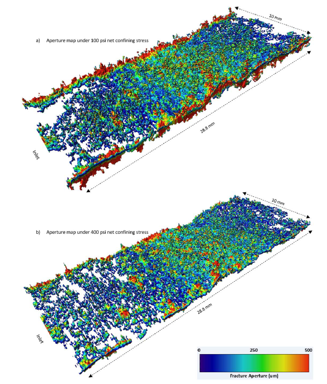 Phase saturations, fluid occupancy maps, and statistical information related to the fracture and matrix were extracted from the reconstructed data using Avizo with a modified workflow In the first step, we applied nonlocal means and median filters to smoothen the raw images and sharpen the phase boundaries. Next, filtered, wet image sets (i.e., images with the fluid phases) were aligned with their corresponding reference image sets by moving them pixel-by-pixel in the X, Y, and Z directions until a suitable registration was achieved. Further, we used a volume edit module to assign zero value for the exterior of the scanned locations. All the wet images were then multiplied pixel-by-pixel by the pore map (binary image) obtained from corresponding reference images to generate a gray-scale image with zero and nonzero values representing solid and different fluids present in the pore space, respectively. Thus, different phases that coexisted in the pore space could be identified by deploying a segmentation method that used different intensity peaks in the multiplied images. This could be done since the solid phase was absent. The solid phase was then added to the segmented fluid phases (i.e., oil and brine) to construct a final three-phase labeled image. In order to separately quantify saturation in the matrix and fracture, we created individual masks of the fracture and the matrix sections by manually tracking and segmentation of the fracture plane. These masks were then combined with the segmented wet images to generate three-dimensional fluid occupancy maps inside the fracture and the matrix. This step was time consuming since we needed to accurately track the fracture plane and identify the borders based on visual evaluation and by use of a drawing tool in Avizo Software.