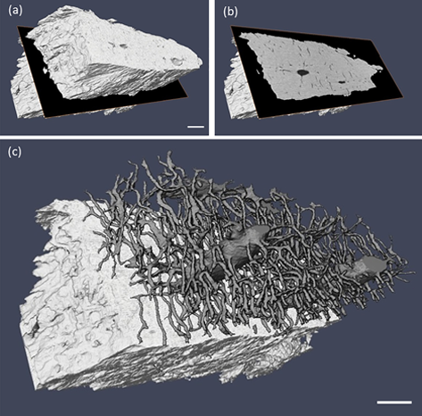 A preliminary gray-level thresholding together with fill and closing operations, masks the air background around the sample and selects only the bone mineral matrix and LCN for segmentation using Avizo 3D software (Avizo 3D Software|FEI Software, n.d.).