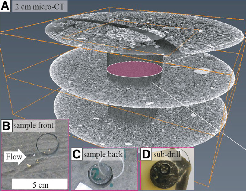 For smaller samples individual clasts are well recognized and 2D grain size distribution was computed automatically using several workflows using the software Avizo. Preliminary comparison with manual segmentation shows that 2D automatic segmentation is reliable and is consequently applicable to compute 3D grain size distribution.