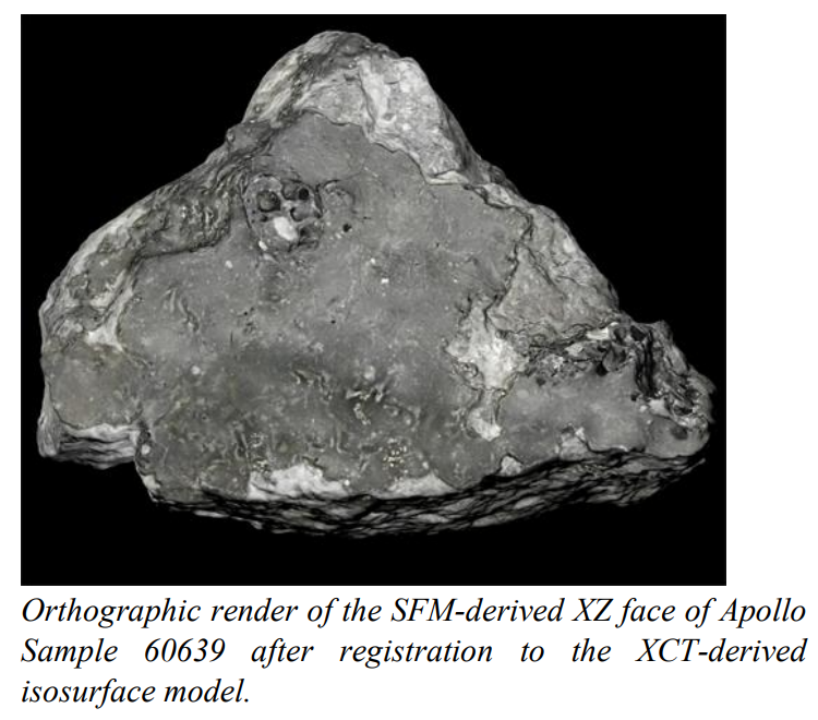 Apollo Lunar Sample 60639, collected as part of rake sample 60610 during the 3rd Extra-Vehicular Activity of the Apollo 16 mission in 1972, served as the first NASA preserved lunar sample to be examined by our team in the development of a novel approach to internal and external sample visualization. Apollo Sample 60639 is classified as a breccia with a glass-coated side and pristine mare basalt and anorthosite clasts. The aim was to accurately register a 3-dimensional Micro X-Ray Computed Tomography (XCT)-derived internal composition data set and a Structure-From-Motion (SFM) Photogrammetry derived high-fidelity, textured external polygonal model of Apollo Sample 60639. The developed process provided the means for accurate, comprehensive, non-destructive visualization of NASA’s heritage lunar samples. The data products, to be ultimately served via an end-user web interface, will allow researchers and the public to interact with the unique heritage samples, providing a platform to “slice through” a photo-realistic rendering of a sample to analyze both its external visual and internal composition simultaneously.