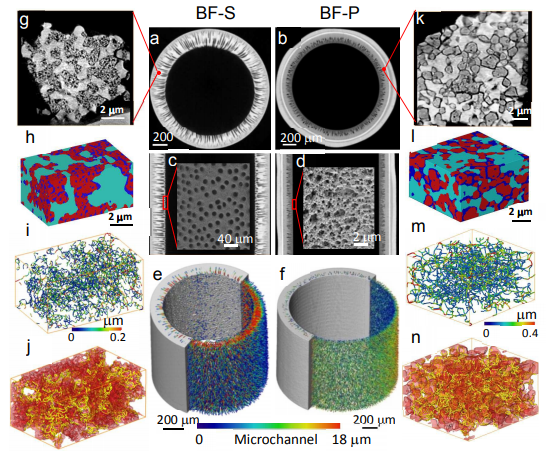 In this study we investigate hierarchically structured micro-tubular solid oxide fuel cells (MT-SOFC) fabricated by phase inversion technique and quantitatively assess the mass transport and electrochemical performance improvement compared to a conventional tubular SOFC. We present pioneering work to characterize the effective mass transport parameters for the hierarchically porous microstructures by an integrated computed fluid dynamics simulation, assisted by multi-length scale 3D X-ray tomography. This has been historically challenging because either imaging resolution or field of view has to be sacrificed to compensate for the wide pore size distribution, which supports different transport mechanisms, especially Knudsen flow. Results show that the incorporation of radially-grown micro-channels helps to decrease the tortuosity factor by approximately 50% compared to the conventional design consisting of a sponge-like structure, and the permeability is also improved by two orders of magnitude. When accounting for the influence of Knudsen diffusion, the molecule/wall collisions yield an increase of the tortuosity factor from (continuum flow) to (Knudsen flow), but the addition of micro-channels help to reduce it down to Electrochemical performance simulations using the measured microstructural and mass transport parameters show good agreement with the experimental results at elevated temperatures. The MT-SOFC anode displays 70% less concentration overpotential, 60% higher power density (0.98 vs. 0.61 W cm-2) and wider current density window for maximum power density than the conventional design.
