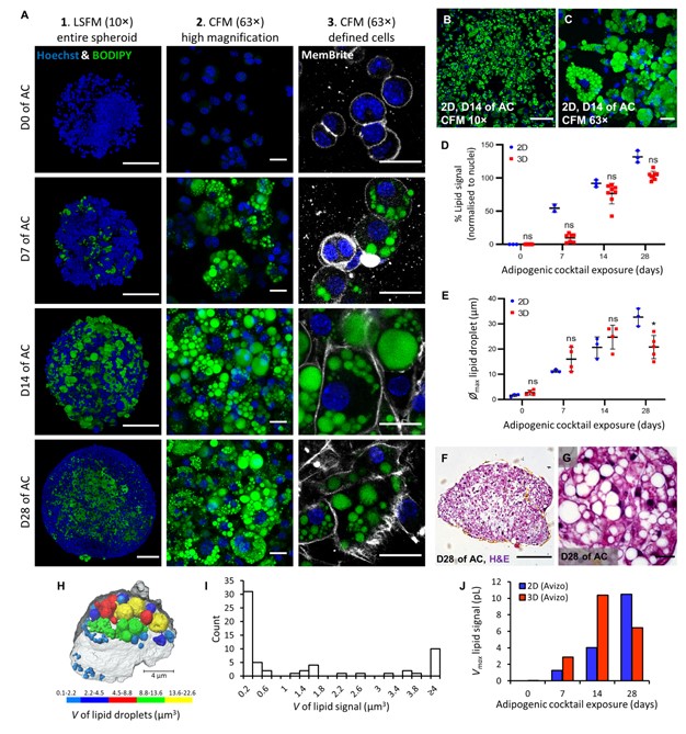 Here, spheroids (680 ± 60 μm) comprising adipogenic 3T3-L1 cells encapsulated in 3D matrix were fabricated manually on a 96 well scale. Spheroids were highly characterised for lipid morphology, selected metabolite and adipokine secretion, and gene expression; displaying significant upregulation of certain adipogenic-specific genes compared with a 2D model. Furthermore, induction of lipolysis and promotion of lipogenesis in spheroids could be triggered by exposure to 8-br-cAMP and oleic-acid respectively. Metabolic and high content imaging data of spheroids exposed to an adipose-targeting drug, rosiglitazone, resulted in dose-responsive behavior. Thus, our 3D WAT model has potential as a powerful scalable tool for compound screening and for investigating adipose biology.