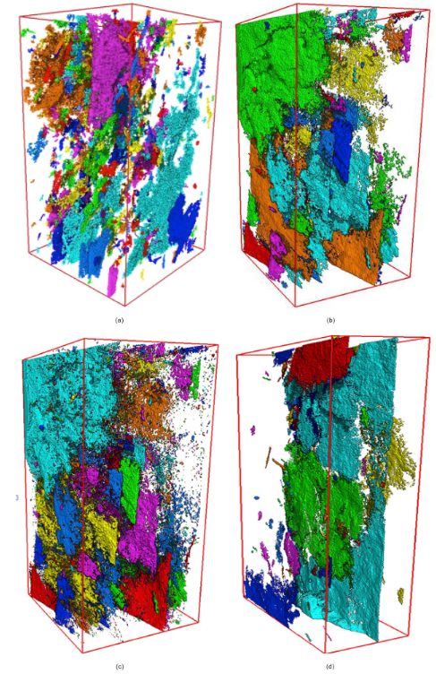 The first step is to use the Avizo software package Fire version to read 2008 grayscale images of the sample. (…) To identify cracks from the greyscale images is a prerequisite of the analysis of cracks. A suitable threshold value should be carefully selected by using the threshold tool in Avizo and then the binary label-data are exported for each sample. (…) We focus on the analysis of cracks in this study, thus it is necessary to remove the isolated small pores by using the functionality of ‘removing islands’ in Avizo. (…)
