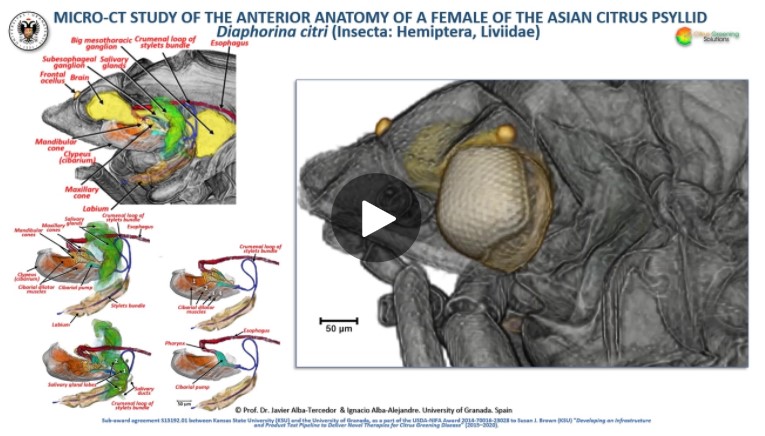 Here we detail an anatomical study of the external and internal anatomy (excluding the reproductive system) using micro-computed tomography (micro-CT). This is the first complete 3D micro-CT reconstruction of the anatomy of a psylloid insect and includes a 3D reconstruction of an adult feeding on a citrus leaf that can be used on mobile devices. Detailed rendered images and videos support first descriptions of coxal and scapus antennal glands and sexual differences in the internal anatomy (hindgut rectum, mesothoracic ganglion and brain). This represents a significant advance in our knowledge of ACP anatomy, and of psyllids in general. Together the images, videos and 3D model constitute a unique anatomical atlas and are useful tools for future research and as teaching aids.